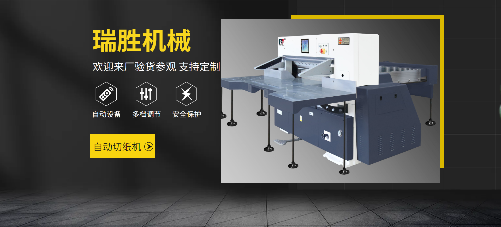 瑞安市瑞勝機(jī)械有限公司是一家專業(yè)集“生產(chǎn)、銷售、服務(wù)”于一體的印刷包裝機(jī)械企業(yè);有二十余年專業(yè)制造切紙機(jī)的經(jīng)驗(yàn),在切紙機(jī)行業(yè)中享有較高聲譽(yù)。研制出集光、機(jī)電、液為一體的高性能高品質(zhì)的切紙機(jī)系列產(chǎn)品,主要產(chǎn)品有電腦切紙機(jī),雙液壓電腦切紙機(jī),雙導(dǎo)軌數(shù)顯切紙機(jī),快捷式壓痕機(jī)系列,覆膜機(jī)、上光機(jī)、燙金機(jī)等系列產(chǎn)品。